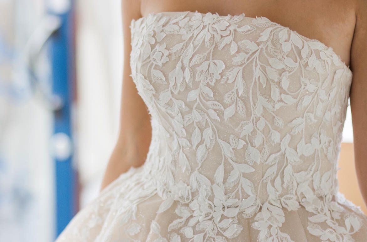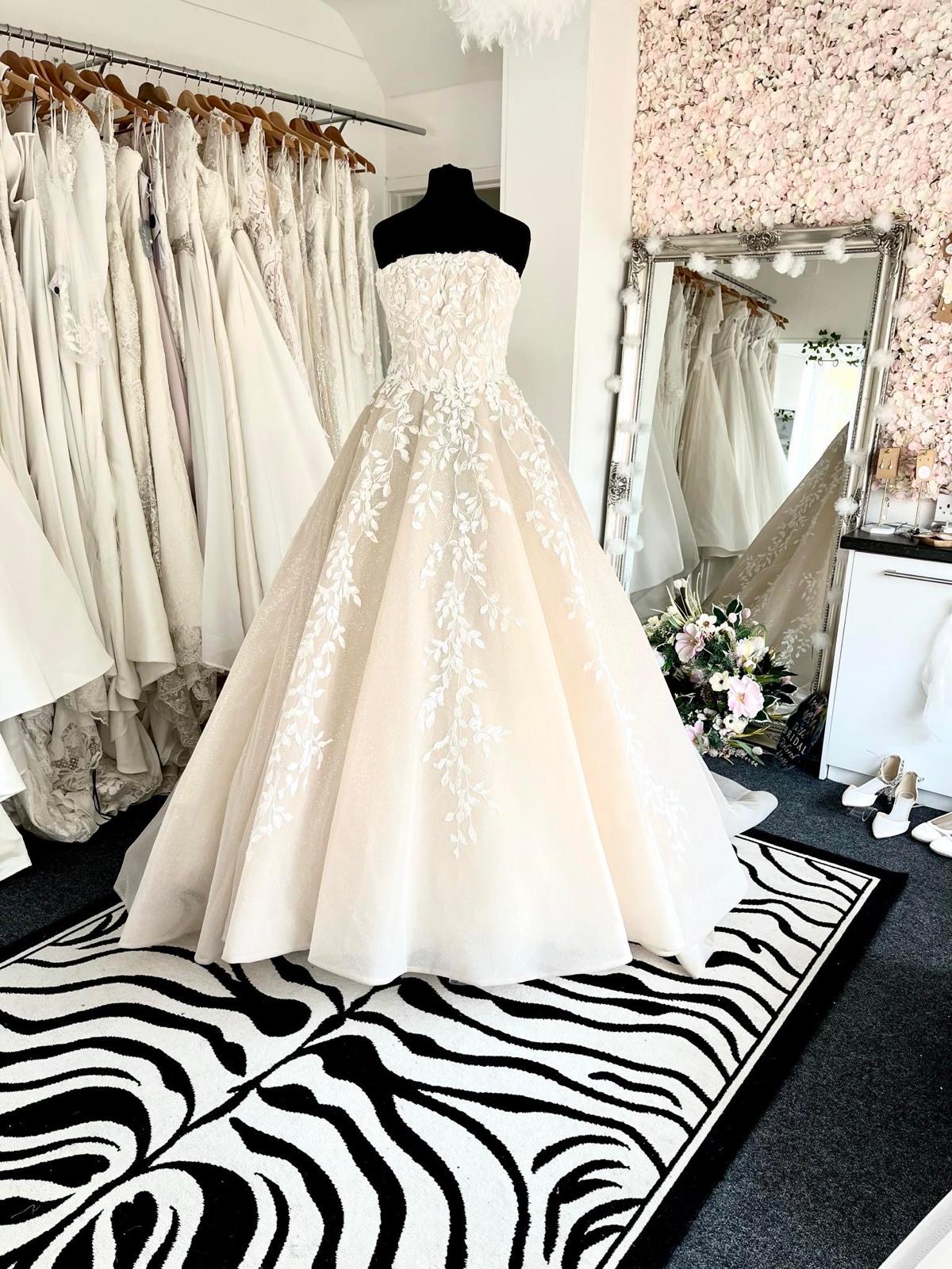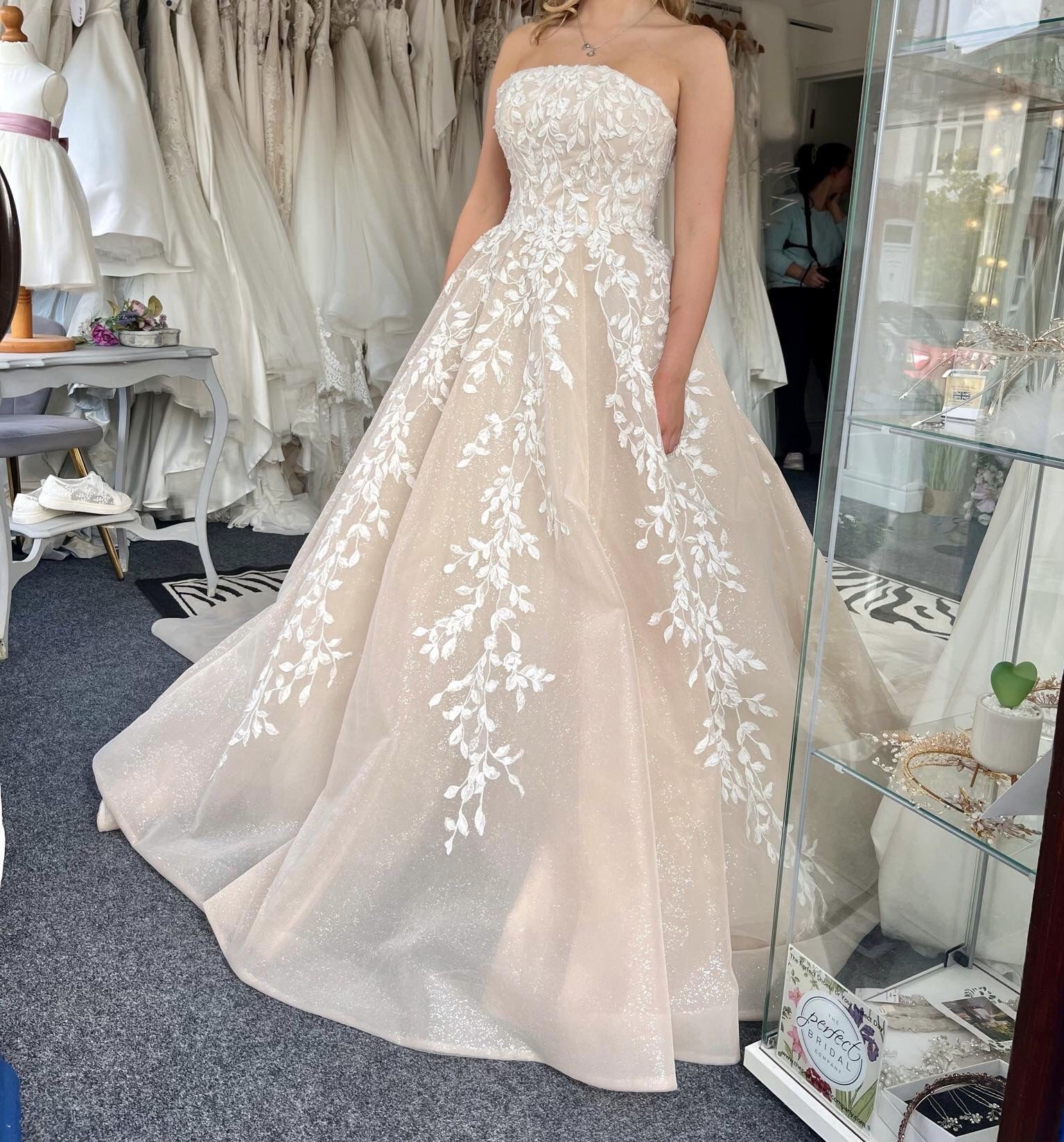 This enchanting ballgown blends classic romance with modern elegance. Designed with a champagne underlay and finished with intricate ivory botanical lace, it features a structured strapless bodice and a full skirt that glistens with delicate shimmer. Perfect for the bride who dreams of a timeless yet unique look on her wedding day.