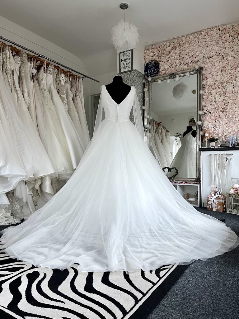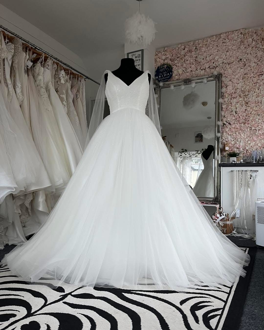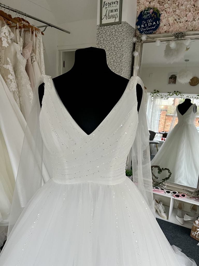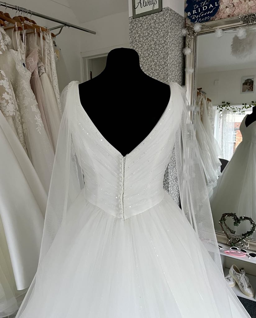 This A-line gown, is such a romantic look, with its full skirt, sequin detailing and tulle shoulder streamers, that fall from the shoulders creating a whimsical look.