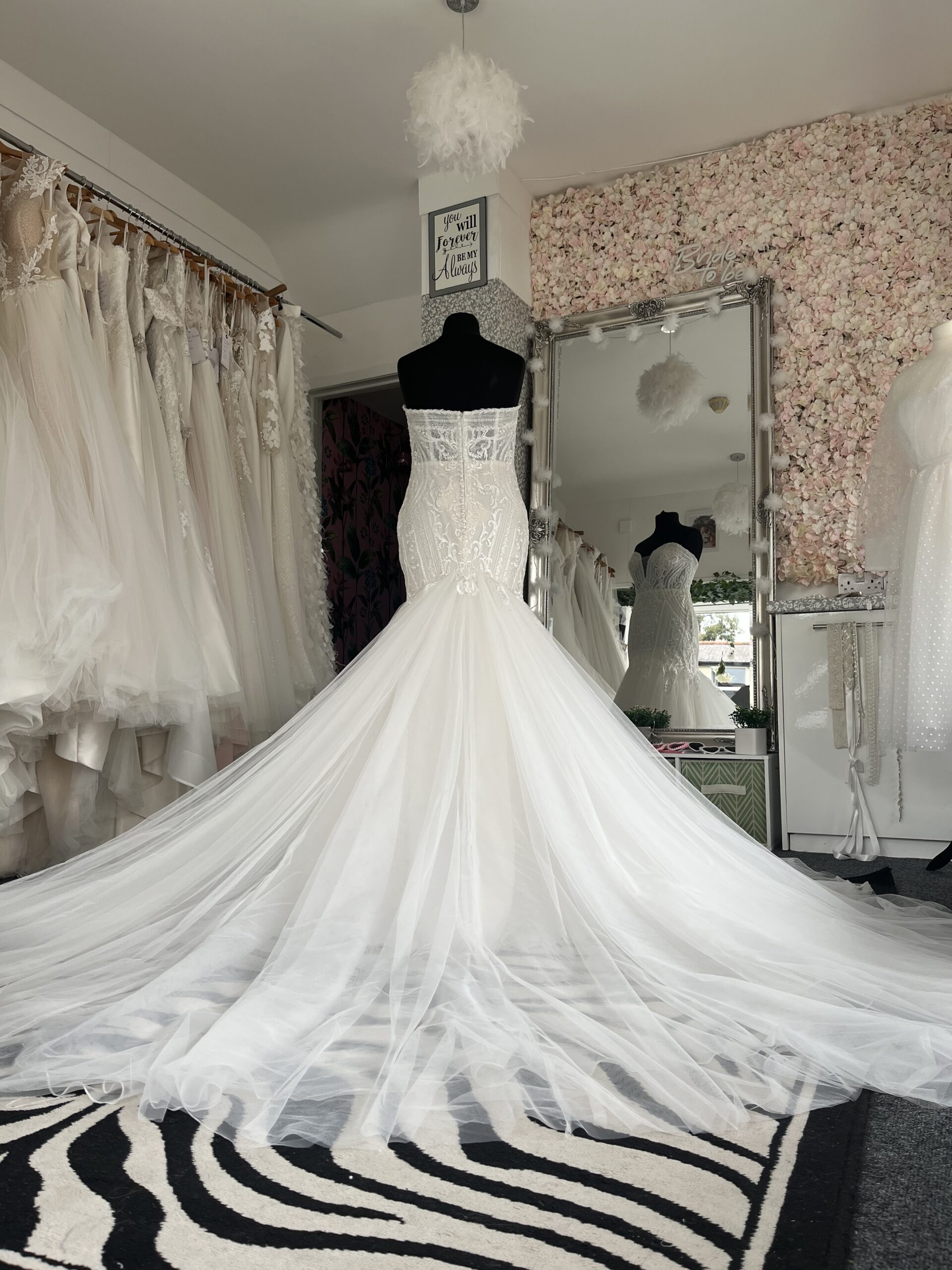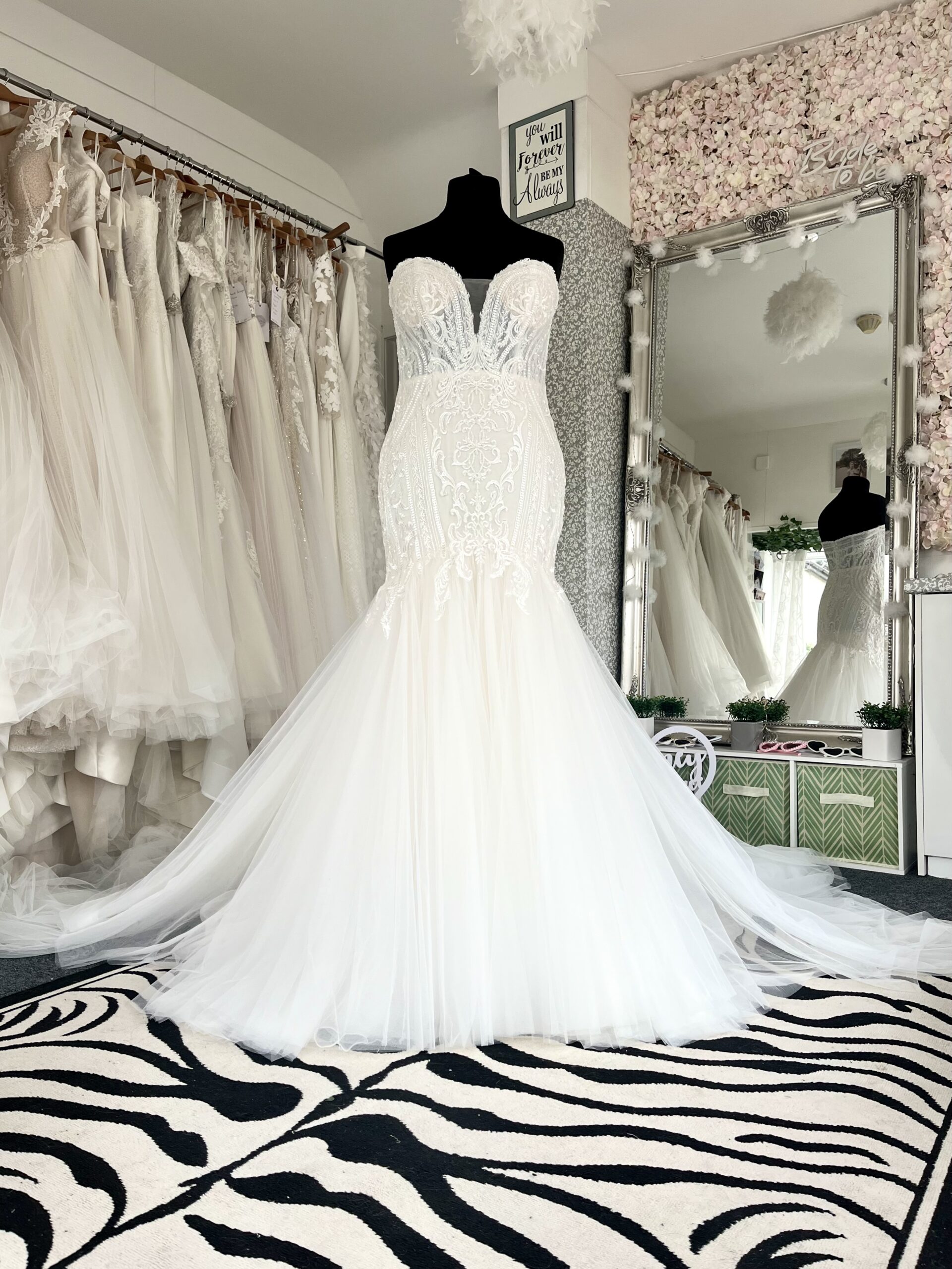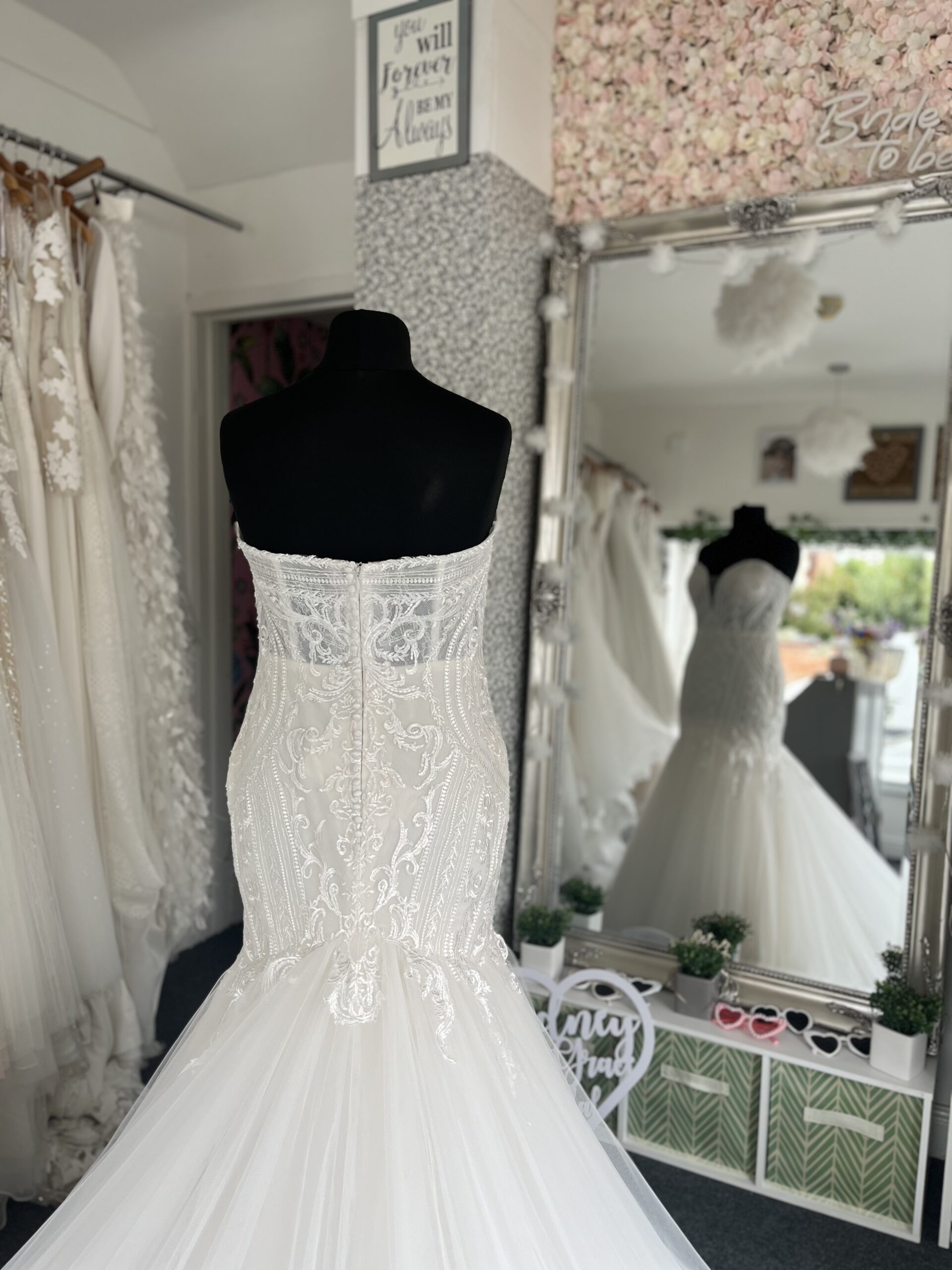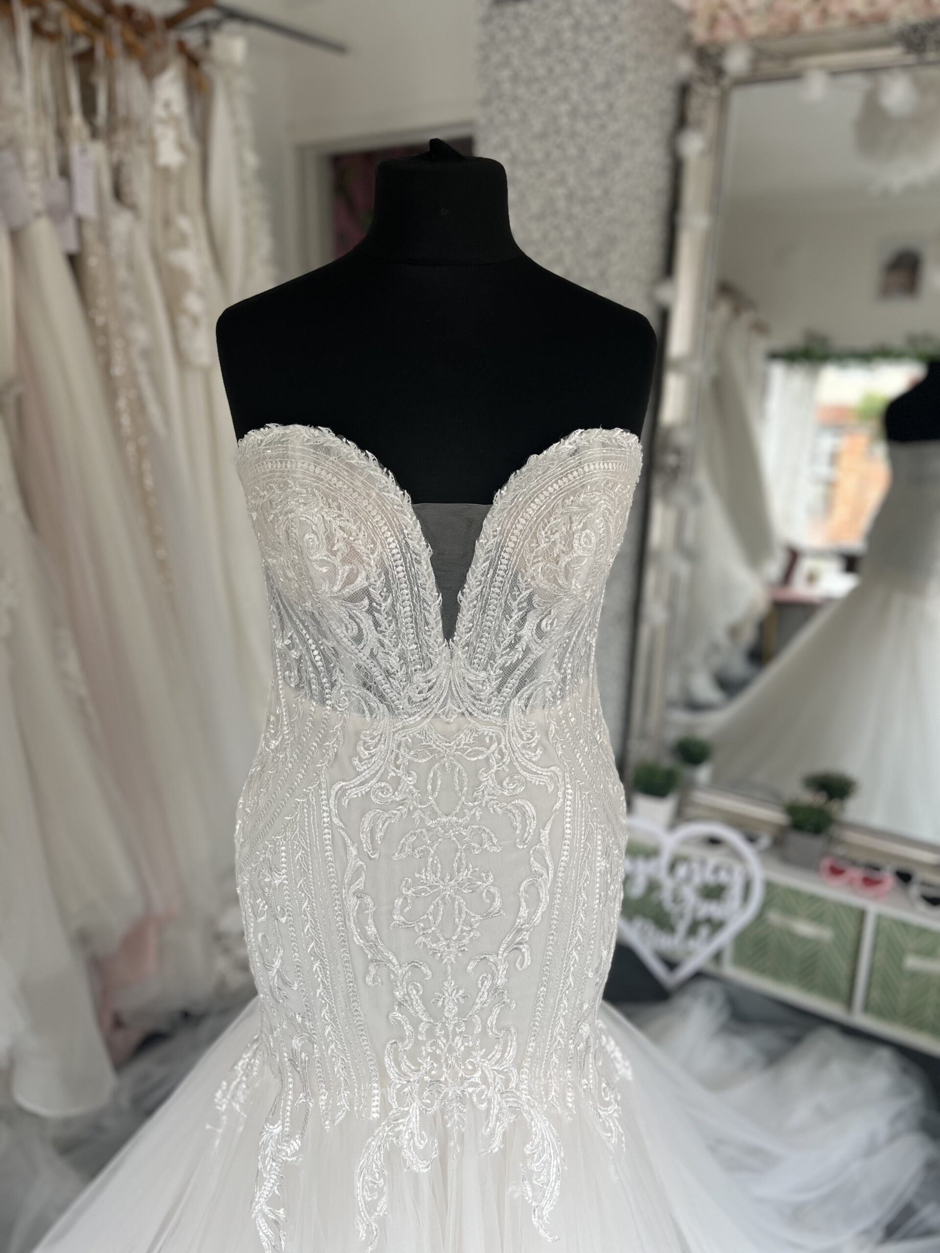 A glamorous mermaid wedding gown with a structured strapless bodice, intricate lace detailing, and a dramatic tulle skirt that flows into a soft train.
