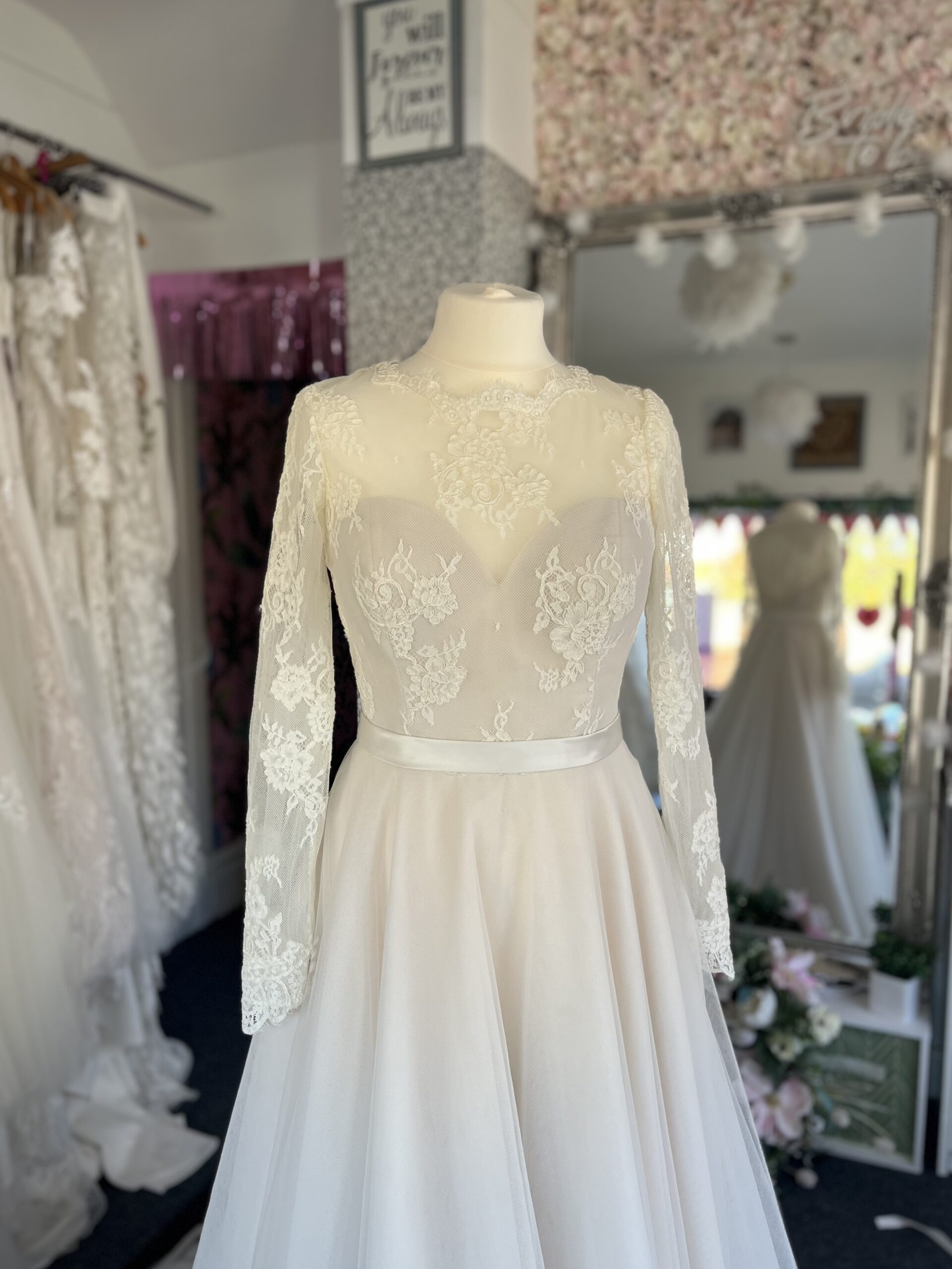 The dress features a beautifully fitted bodice adorned with delicate lace appliqués that trail across the sheer long sleeves and illusion neckline.