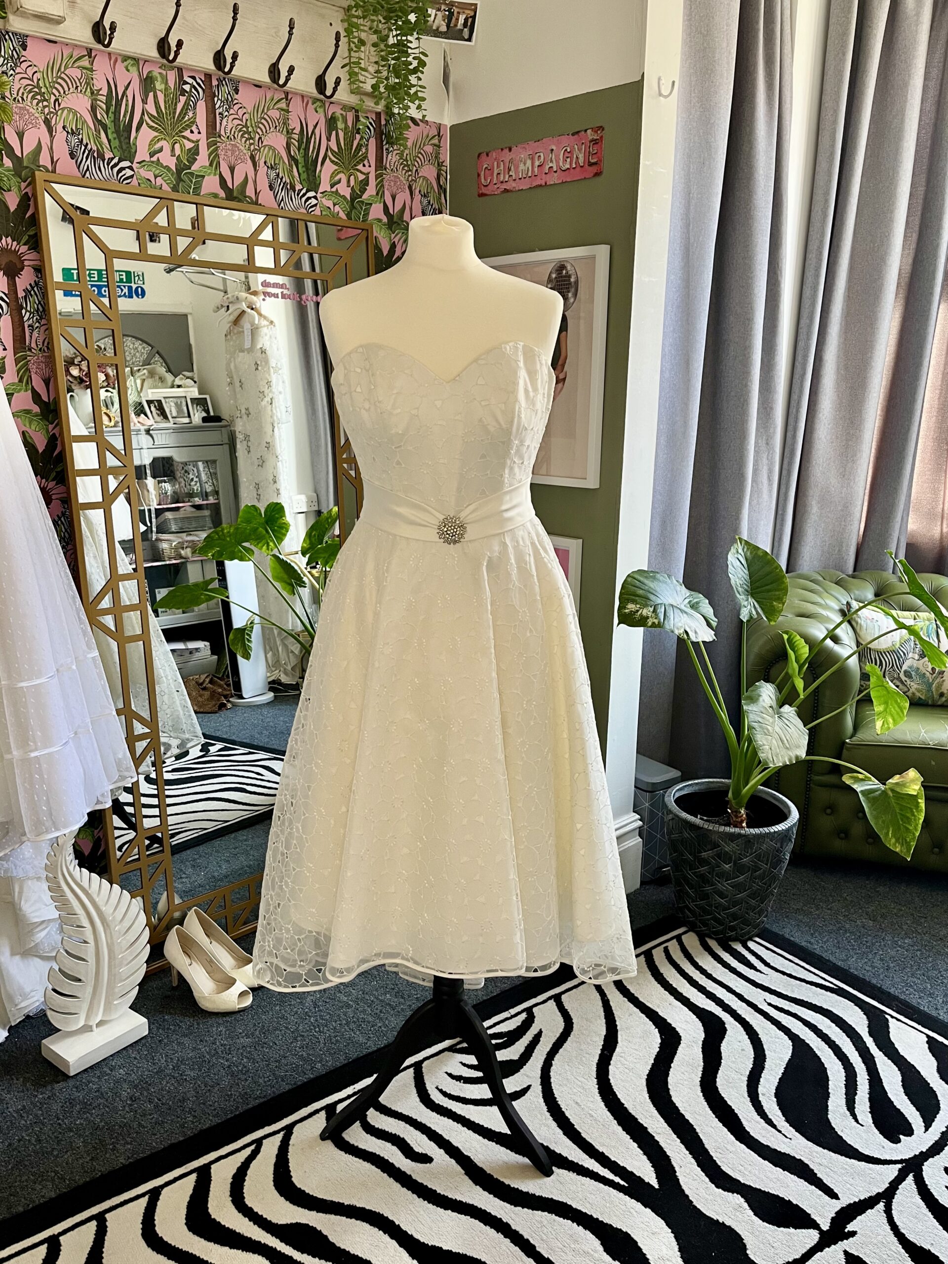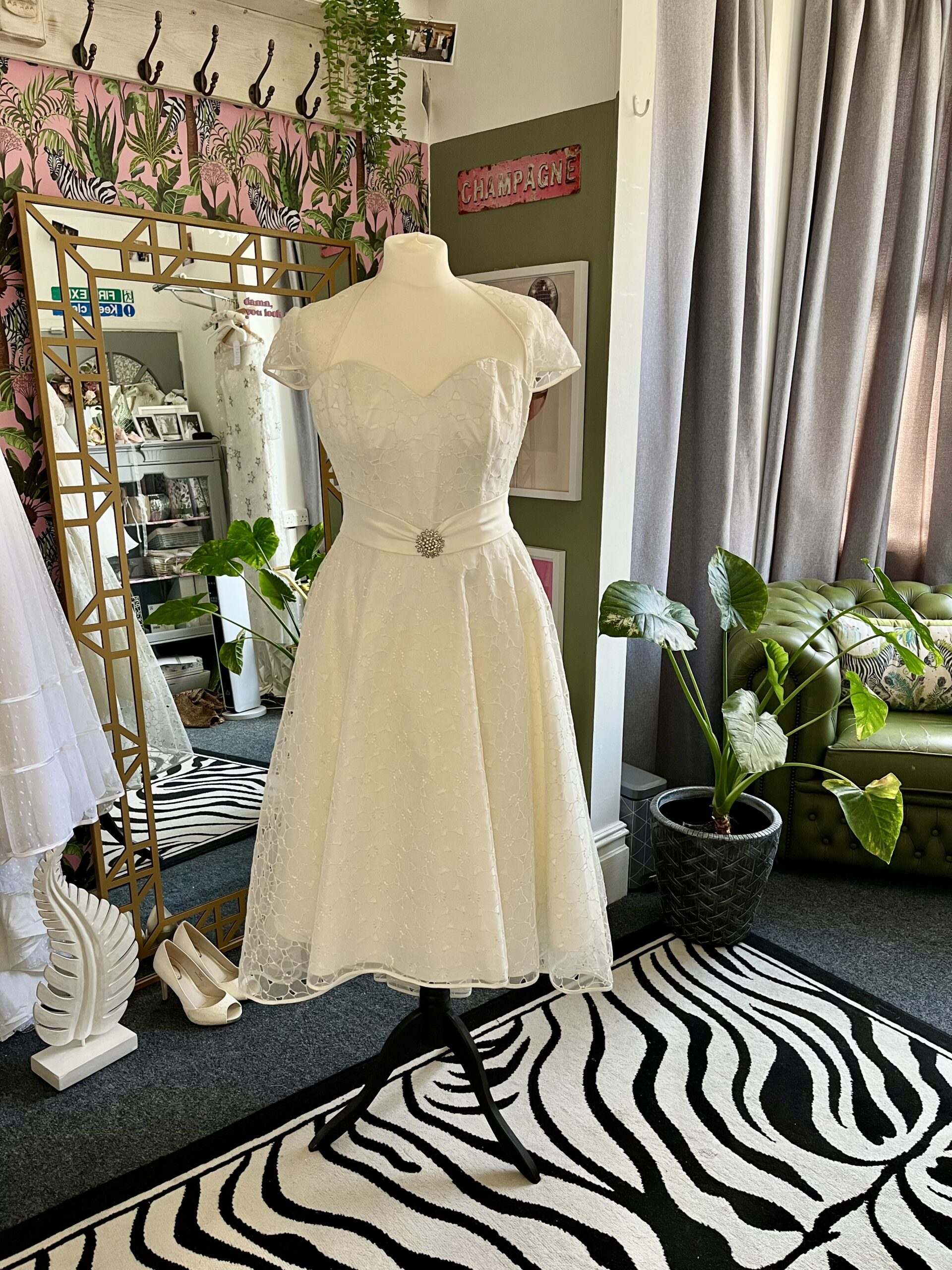 This charming tea-length wedding dress is the perfect blend of vintage glamour and playful elegance.